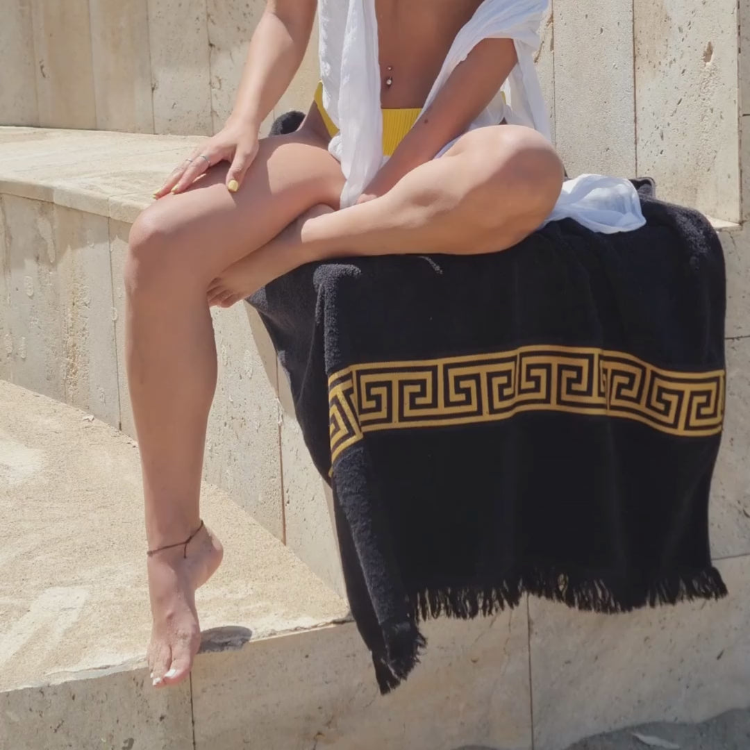 La serviette est conçue en noir et or, avec un tissage sur le dessus représentant l'art antique classique, à savoir le "motif clé grec", et avec le logo VESTA Salonika sur le bas de la serviette en or.